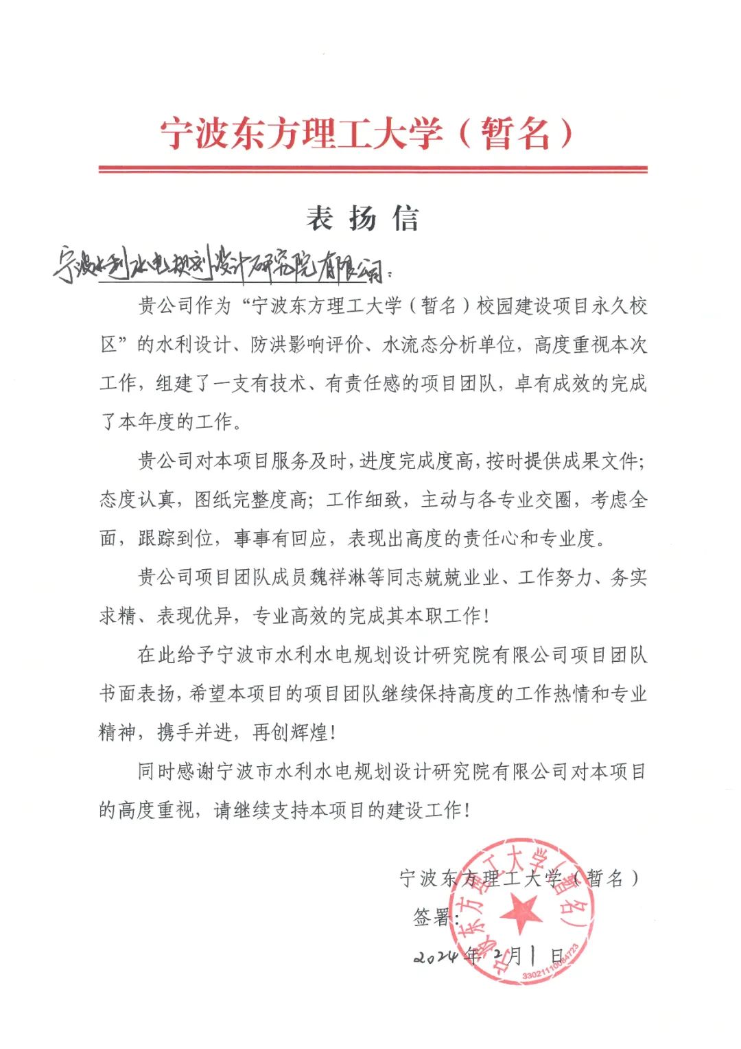 發(fā)布日期:2024.02.07 辭舊迎新之際,寧波市水利院收到寧波東方理工大學的感謝信。信中提到,我院在寧波東方理工大學(暫名)校園永久校區(qū)建設項目中,派出的項目團隊高效、專業(yè)、及時地做好技術支撐服務工... -