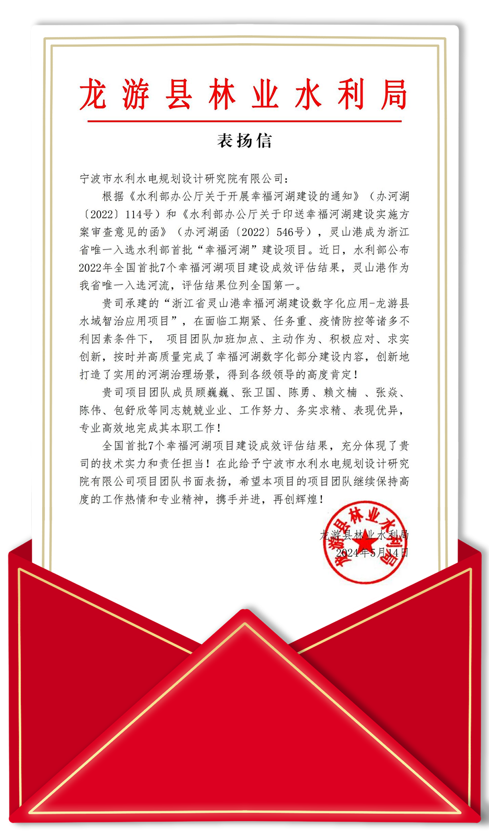 發(fā)布日期:2024.06.05 ? ? ? ?近日,我院收到一封來自業(yè)主單位衢州市龍游縣林業(yè)水利局的表揚信。信中提到:我院在承建“浙江省靈山港幸福河湖建設數(shù)字化應用-龍游縣水域智治應用項目”的過... -