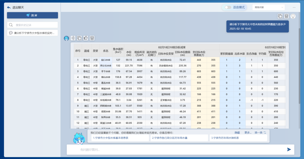 基于前端感知的降雨、水位、流量、工程運行等實時信息,借助DeepSeek大模型和“甬水院智算”算法庫,能夠實時對流域防汛形勢進行快速分析,包括降雨形勢、水情預警、預泄分析、水庫納蓄分析等,可以按照規(guī)定的表單形式一鍵輸出成果,為防汛防洪工作提供兼具前瞻性、科學性、精準性、安全性的決策支撐。相關學術成果曾以《基于大模型的水利防汛智能問答關鍵技術研究與應用探索》為題于去年8月的第七屆城市水安全與水管理學術交流會作專題匯報。