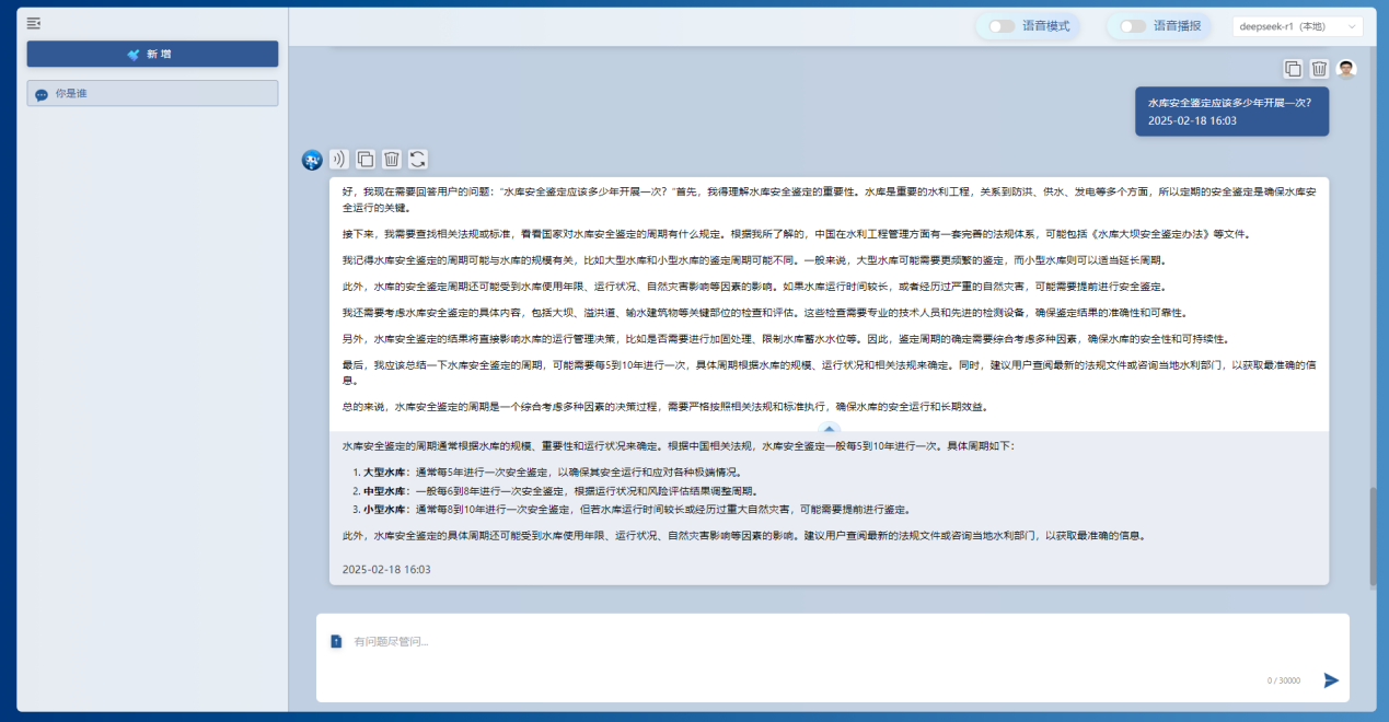 基于本地部署的DeepSeek-r1模型和私域知識庫,通過該工具能夠實現(xiàn)對水利行業(yè)的水旱災害防御、水資源管理、水工程管理、水生態(tài)保護等各領域知識的高效檢索問答,節(jié)省大量查閱資料的時間,提高工作效率。