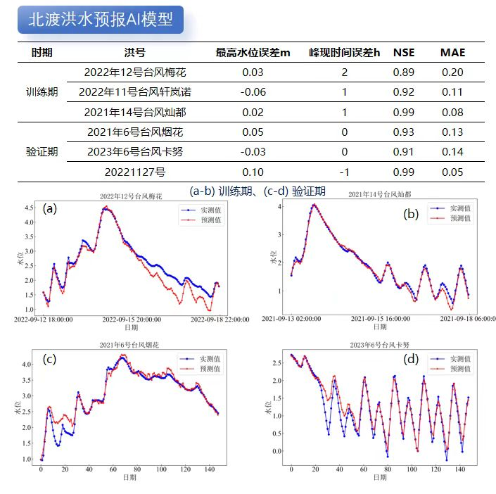 利用成熟水利專業(yè)模型模擬計算不同降雨潮位邊界條件下的洪水過程數(shù)據(jù),再基于DeepSeek對海量洪水模擬數(shù)據(jù)成果進行模型訓練和蒸餾。目前我院已對北渡、鎮(zhèn)海等重要流域控制站點進行了AI洪水預報模型訓練和精度驗證,結果表明AI洪水預報的準確性不輸傳統(tǒng)水利專業(yè)模型。