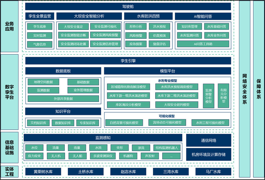 《方案》以黃栗樹等五座水庫為核心對(duì)象,進(jìn)行了前瞻性的信息化總體設(shè)計(jì)。旨在通過引入先進(jìn)信息技術(shù),構(gòu)建覆蓋水庫運(yùn)行管理全生命周期的智能化體系。該體系以實(shí)現(xiàn)對(duì)水雨情、工情、供用水、水質(zhì)及安全狀況等關(guān)鍵要素的精準(zhǔn)感知、動(dòng)態(tài)監(jiān)測(cè)、智能分析與高效決策為核心目標(biāo),全面提升水庫在科學(xué)調(diào)度、風(fēng)險(xiǎn)防控、管理效能與服務(wù)保障方面的綜合能力。主要建設(shè)內(nèi)容涵蓋智慧業(yè)務(wù)應(yīng)用、數(shù)字孿生平臺(tái)、信息基礎(chǔ)設(shè)施及網(wǎng)絡(luò)安全體系,共同構(gòu)成層次清晰、協(xié)同聯(lián)動(dòng)、安全可靠的現(xiàn)代化水利信息化總體框架,為區(qū)域水安全與可持續(xù)發(fā)展奠定堅(jiān)實(shí)的數(shù)字基石。