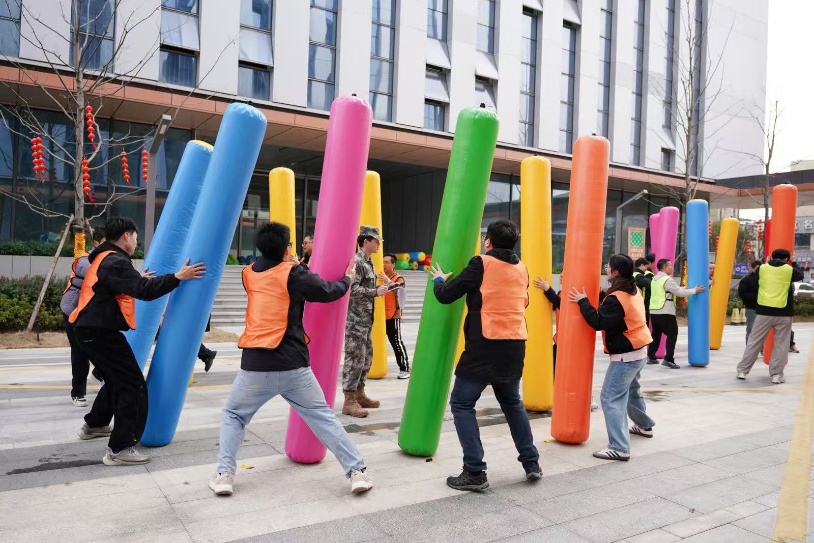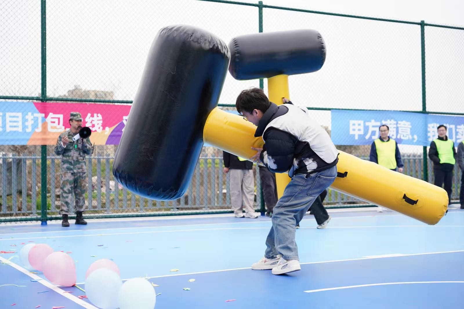 在“南水北調(diào)”項目中,隊員們手持PVC管接力運水,5分鐘內(nèi)爭分奪秒,讓水流在管中傳遞涌向重點,仿佛將團(tuán)隊的信任與責(zé)任匯聚成河。“龜兔賽跑”則讓隊員們化身可愛的“烏龜”和“兔子”,在賽道上你追我趕,妙趣橫生。“鴻運亨通”需要8人共同托舉大球折返跑,大家步調(diào)一致,齊頭并進(jìn)。“一錘定音”環(huán)節(jié),隊員們揮動充氣大錘敲破氣球,每一聲“砰”響都引來陣陣喝彩。
