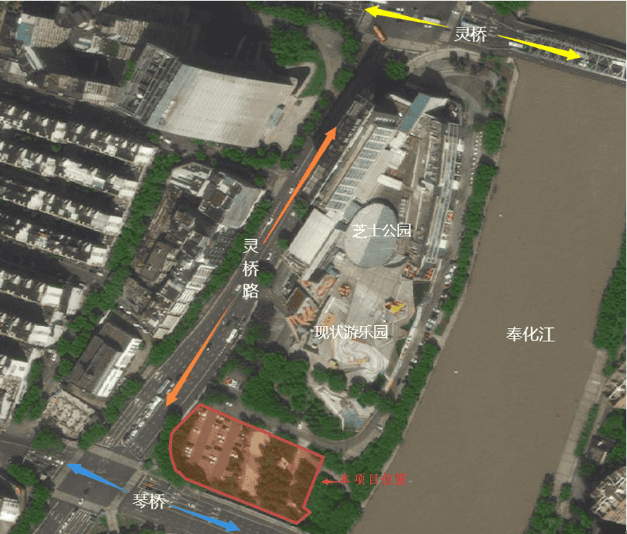 項目地塊位于芝士公園南側,東臨奉化江,南鄰琴橋,西臨靈橋路,北至現(xiàn)狀游樂場。芝士公園位于寧波市海曙區(qū)靈橋路768號,處于寧波核心地段三江口,臨近奉化江,對內對外交通十分便利,區(qū)域優(yōu)勢明顯。