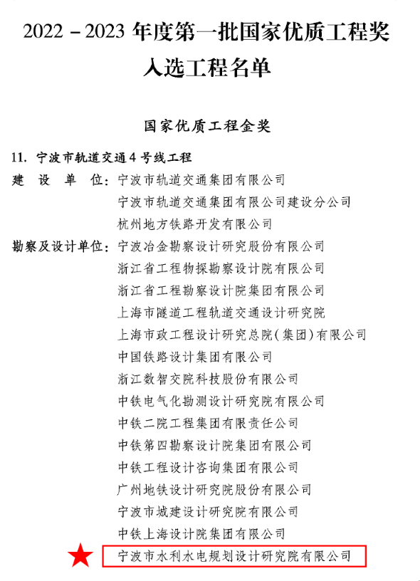 喜訊!我院參與設(shè)計(jì)的寧波軌道交通4號線工程榮獲國家優(yōu)質(zhì)工程金獎